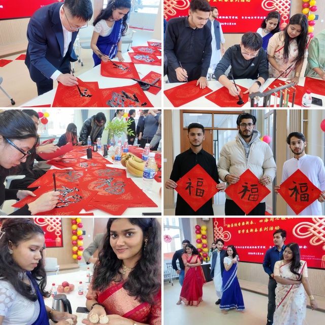 活动现场暖意萦绕,年味浓郁。裴俊瑞与留学生一同提笔书“福”,落纸生香;巧手包饺,捏合情谊。在笑语与协作中,传统年俗悄然流淌为温暖的记忆。裴俊瑞向留学生亲切讲解“福”字背后的文化意蕴,并为同学们送上诚挚的新春祝愿。他勉励大家珍惜求学时光,深耕医学专业,积极体验中国文化,当好中外交流的使者。留学生们由衷感谢学校的暖心安排,并即兴献上一段特色印度舞蹈。翩跹舞姿洋溢着热情与感激,将现场氛围推向高潮。