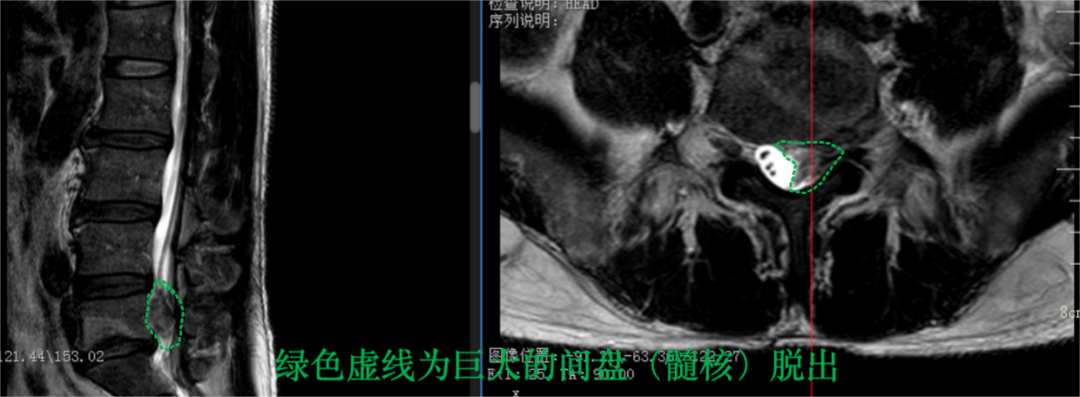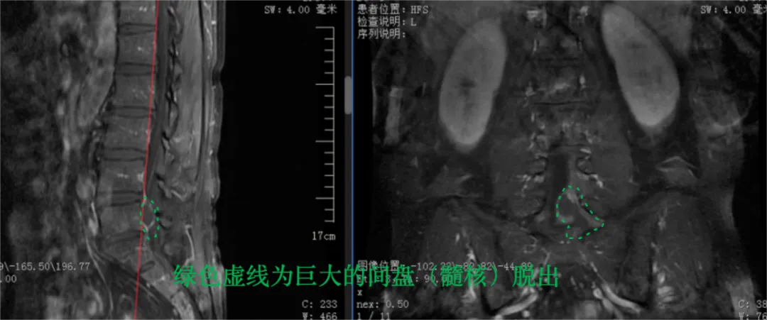 经腰椎CT、MRI影像学检查及临床体格检查评估,患者被明确诊断为“腰椎间盘突出症(L5-S1重度向上脱出)”。尤伟夫副主任医师介绍,重度腰椎间盘脱出本身属于腰椎疾病中的重症,该患者病情更为特殊:巨大的脱出椎间盘组织完全突破后纵韧带,于腰5骶1节段向上移位至上位椎体和上位椎间隙,对椎管侵占率近60%,为典型的重度向上脱出病例。