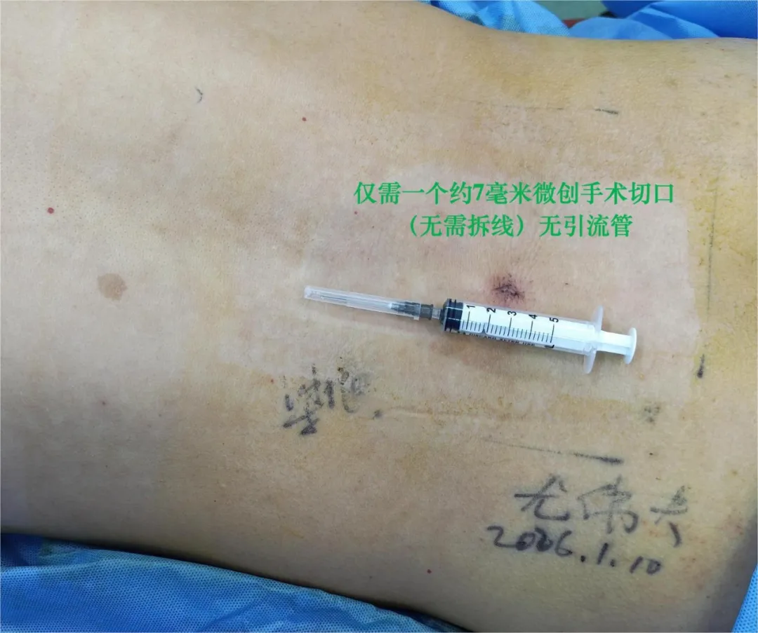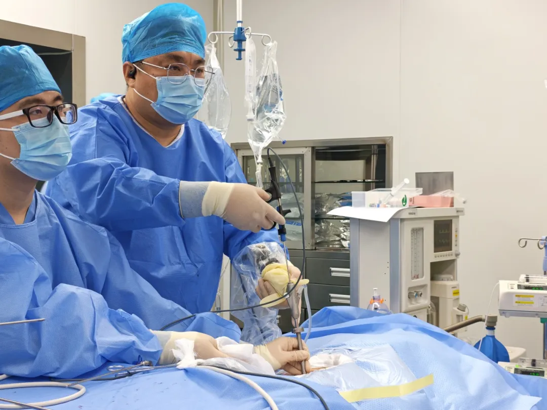 手术中,尤伟夫副主任医师以“最小创伤、最大减压”为核心原则,借助精细微创器械,凭借多年骨科临床经验、娴熟的微创操作技巧及对脊柱解剖结构的深刻理解,避开周围神经、血管等重要组织,在高清脊柱内镜显示器辅助下,通过一个7mm左右的微小切口(无需拆线),精准定位向上脱出的椎间盘组织,完成椎间盘髓核摘除、神经根松解减压、椎管扩大成形等关键操作。手术衔接有序,顺利完成,术中出血量不足10毫升,实现“微创、精准、安全”的治疗目标,既解除了神经根的严重压迫,又最大程度保留了腰椎稳定性与生理功能,成功应对该罕见重症病例的诊疗挑战。