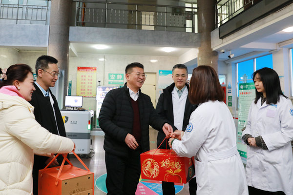 张可勇副书记一行先后走访了门诊、急诊、住院病房大楼及附属四院,看望了急诊科主任李纪、泌尿外二科主任王立鹤、附属四院开放病区主任梁雪梅等一线医务人员代表。每到一处,学院领导都与在岗职工亲切握手、热情交谈,详细询问节日工作安排和后勤保障情况,感谢大家“舍小家、为大家”坚守一线,并送上慰问品。张可勇副书记高度赞扬了医务人员恪尽职守的职业精神,并向他们及家属致以新春问候。