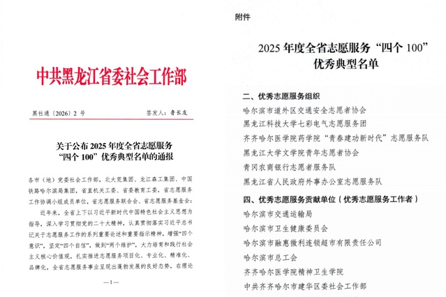 同时,齐齐哈尔医学院精神卫生学院在组织、协调、推动志愿服务工作中表现卓越,成效显著,荣获“全省优秀志愿服务贡献单位”称号。精神卫生学院立足社会工作、应用心理学、精神医学等专业特色,不仅有效服务了社会大众,也为学院乃至更广泛区域的志愿服务工作科学化、专业化发展贡献了智慧和力量,展现了教育工作者的敬业精神与专业素养。