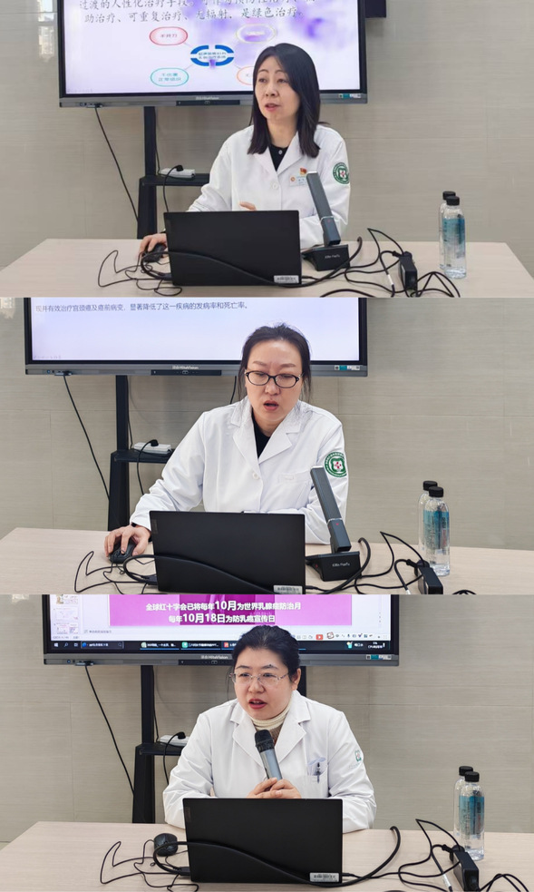 活动现场,我院三位资深专家带来干货满满的科普健康知识分享。超声科梁笑主任以《高强度聚焦超声在妇科疾病治疗的应用》为题,结合自身30年的超声诊断经验和省内率先开展高强度聚焦超声(HIFU)技术的实践成果,深入浅出讲解了无创超声治疗妇科疾病的前沿技术;妇二科副主任医师董冰围绕《宫颈癌筛查知识科普》,系统讲解了宫颈癌的筛查要点、预防措施,为女性宫颈健康筑牢防线;乳腺外科副主任医师李娜针对《乳腺疾病的高危因素》展开科普,结合临床案例剖析乳腺疾病的诱因、早期症状及筛查方法,让现场女性对乳腺健康有了更全面的认知。专业的讲解、实用的知识,让现场听众受益匪浅。