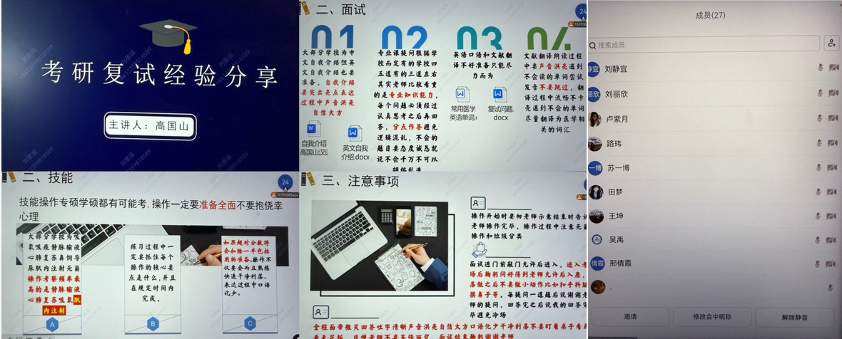 会上,高国山围绕自我介绍、答题技巧、面试礼仪等方面进行分享。同时,他强调了在技能操作中的注意事项。此外,还分享了研究生阶段的社交与发展建议,鼓励学弟学妹们拓宽社交圈层,结交新友。