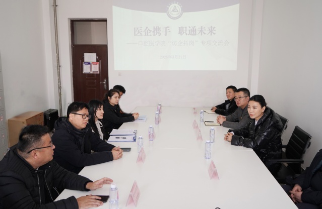 会上,五家单位代表依次介绍了各自医院的发展概况、学科特色及年度用人计划,并结合实际工作对口腔医学专业人才的综合素质、实践能力等方面提出了具体要求。在听取各单位介绍过程中,迟沫涵结合学校专业设置和学生特点,适时与用人单位代表互动交流,围绕基层医院人才成长路径、民营医院职业发展空间、边疆地区就业政策支持等话题,与代表们展开深入探讨。姜鹏也就毕业生实习就业、人才培养等具体合作事项与各单位交换了意见。校企双方围绕当前就业形势、毕业生求职观念、近年来岗位招聘趋势及未来人才需求变化等内容进行了充分交流。大家一致认为,面对新形势,加强校企协同、前置职业引导、提升岗位匹配度是推动高质量就业的关键。交流期间,口腔医学院与五家单位就下一步举办专场招聘会、为毕业生开展职业规划系列讲座等事项达成初步合作意向。