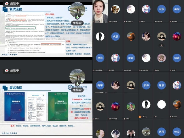 为助力2026届学子平稳备考复试、顺利成功上岸,3月24日下午,精神卫生学院通过腾讯会议线上平台,成功举办第二场考研复试专题培训会。本次会议由辅导员郜莹主持,上一届考研成绩优异的徐鸣泽、单维淼同学担任主讲人,毕业班辅导员张英华及全体考研过线毕业生共同参会。