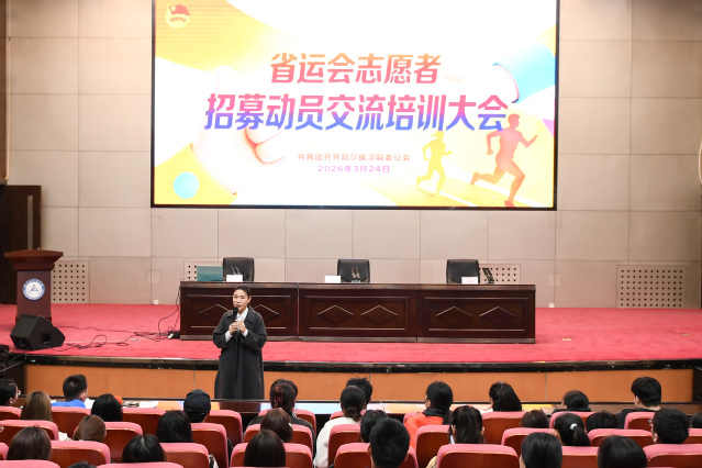 3月24日晚6时,学院2026年省运会志愿者招募动员与交流培训大会在图书行政楼二楼多功能厅举行。学院党委副书记、工会主席迟沫涵出席会议并作动员讲话。会议由团委书记刘柏人主持,学生组织骨干及志愿者代表300余人参加会议。