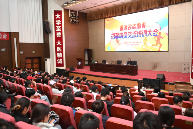 迟沫涵在动员中深刻阐述了省运会的重大意义。她说,2026年黑龙江省第十六届运动会将在齐齐哈尔举行,这是我市继第九届省运会后26年来首次承办如此高规格、大规模的综合性体育赛事,这是整座城市的荣耀,更是每一位齐医学子的责任与机遇。作为齐齐哈尔唯一一所省属本科医学院校,同学们肩负着为省运会提供专业医疗保障、展示城市青年形象的光荣使命。她以郝桐为例,号召大家勇于担当、甘于奉献,提高认知、尝试突破,为人生积累宝贵财富,并向同学们发出三点倡议:一是怀揣热爱,珍惜每一次锻炼自己、服务家乡的机会;二是主动报名、积极加入,一起贡献青春力量;三是认真参加岗前培训,踏踏实实练好本领,以最好的状态迎接盛会。