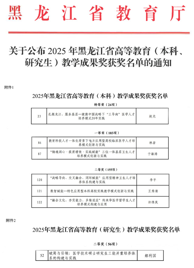近日,省教育厅公布2025年黑龙江省高等教育(本科、研究生)教学成果奖获奖名单,学院共有7项成果获奖,其中特等奖1项、一等奖2项、二等奖4项。获奖等级和数量均创历史新高,尤其是荣获特等奖,实现了学院在省级教育教学成果奖上的历史性突破!为加快推进“创大”“申博”工作注入了强劲动力,标志着学院在高质量发展道路上又迈出了坚实一步。