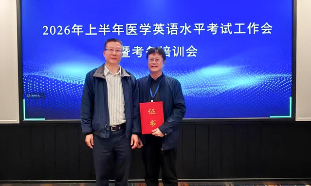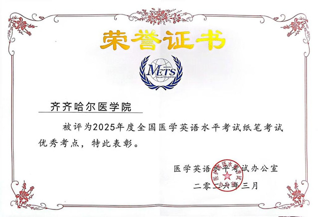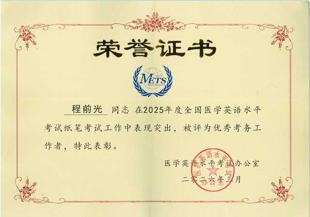 近日,2026年全国医学英语水平考试(METS)工作会暨考务培训会召开,会议对2025年度医学英语水平考试优秀考点和优秀考务工作者进行表彰,齐齐哈尔医学院再次荣获全国医学英语水平考试(纸笔考试)优秀考点称号,外语教研部程前光被评为优秀考务工作者。
