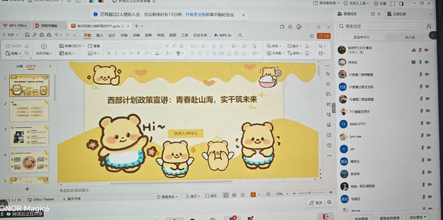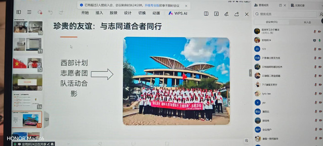 此次分享会让同学们全面了解西部计划内容,深刻感受志愿者无私奉献、勇担使命的精神风貌,进一步激发了青年学子服务基层、报效祖国的热情。同学们纷纷表示,将以优秀志愿者为榜样,把个人理想融入国家发展大局,主动到祖国最需要的地方挥洒青春汗水,让青春在全面建设社会主义现代化国家的实践中绽放绚丽之花。