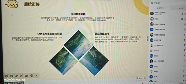 分享会上,三位志愿者结合自身经历,围绕报考材料准备、服务经历、工作感悟与成长收获等内容展开分享。安雨妍回顾西部服务历程,讲述了在陌生环境中适应、成长的故事,分享了抗压能力与沟通技巧的提升,以及收获的珍贵友谊;赵茂婷详细介绍西部计划由共青团中央等部委组织实施的背景,阐释项目引导毕业生服务西部基层的宗旨;钟泽云重点解读西藏地区西部计划政策待遇,说明服务满一年可获当地公务员、事业单位考试资格等优势,并介绍医学类本科生服务岗位特点,为同学们提供实用参考。