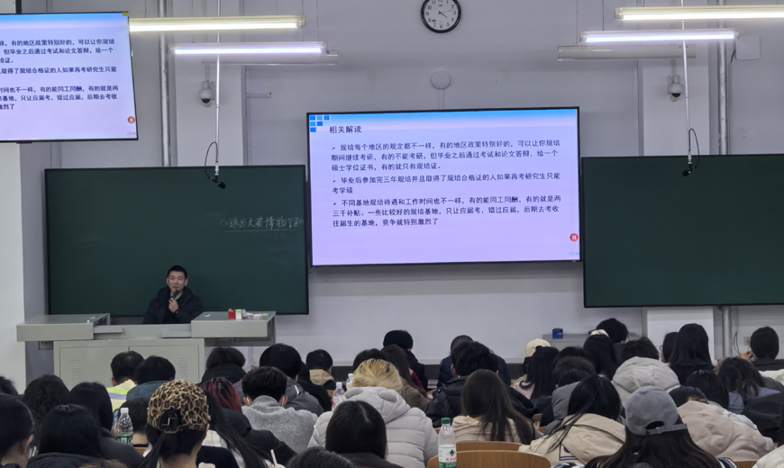 学风建设要落到实处,关键不是一味加压,而是帮学生看清方向、主动作为。为此,口腔医学院于3月6日、13日、20日连续举办了三场考研就业指导系列专题讲座,由学工办主任杨超主讲,全体大四学生参加。