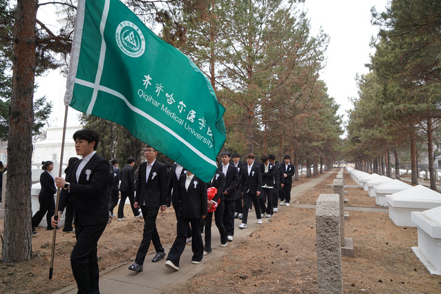 为深切缅怀革命先烈丰功伟绩,厚植青年学子家国情怀,在清明节来临之际,齐齐哈尔市教育局以“重温解放岁月·赓续红色血脉”为主题,在西满革命烈士陵园举行纪念齐齐哈尔解放80周年主题祭扫活动。学院团委副书记丛中流带领学院50名优秀学生代表,受邀参加活动并现场献词,以青春之声致敬革命先烈,以赤子之心传承红色精神。