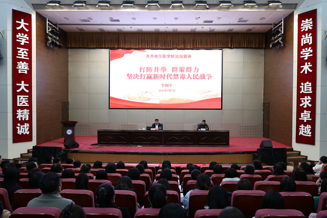 为深入学习贯彻习近平法治思想,扎实推进校地协同育人走深走实,全面筑牢校园禁毒安全坚固防线,4月7日上午,学院特邀齐齐哈尔市委常委、政法委书记、市法学会会长李拥军来院,为广大师生作《打防并举 群策群力 坚决打赢新时代禁毒人民战争》专题法治宣讲。宣讲由学院党委副书记、工会主席迟沫涵主持,市法学会专职秘书长屈健军等政法系统相关人员出席活动,学院有关部门负责人、大中小学一体化建设教师代表、全体辅导员及学生代表现场聆听学习。