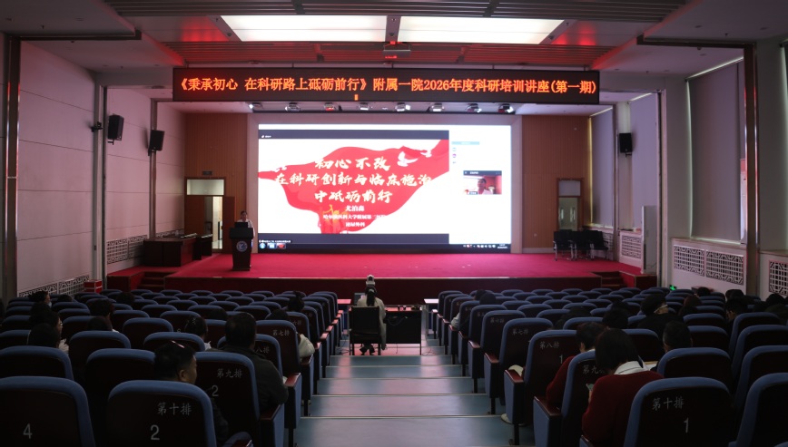 为进一步提升医院临床科学研究水平,以高水平科研助推医院高质量发展,根据《齐齐哈尔医学院附属第一医院2026年党委工作要点》《齐齐哈尔医学院附属第一医院2026年行政工作要点》,4月21日下午,医院在学术报告厅举办了《秉承初心 在科研路上砥砺前行》暨2026年度第一期科研培训。本次会议线上线下同步进行,副院长李春香主持,邀请哈尔滨医科大学附属第二医院泌尿外科副主任医师尤泊森博士担任主讲。医院科主任、护士长、硕士研究生导师、硕士研究生、科研骨干及2026年度科研基金申报者等200余人参加。