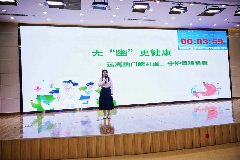 比赛现场,刘志燚以饱满的热情、通俗易懂的表达、贴近群众的科普内容登台展示,重点介绍幽门螺杆菌是Ⅰ类致癌物,具有传播途径多,症状隐蔽等特点,并普及预防法,介绍筛查优势及重点人群,将专业医学知识转化为群众听得懂、用得上、记得住的健康常识,生动诠释了我院职工“普及健康知识、传播科学理念、服务百姓健康”的责任与担当,赢得了现场评委与观众的一致认可与热烈掌声。