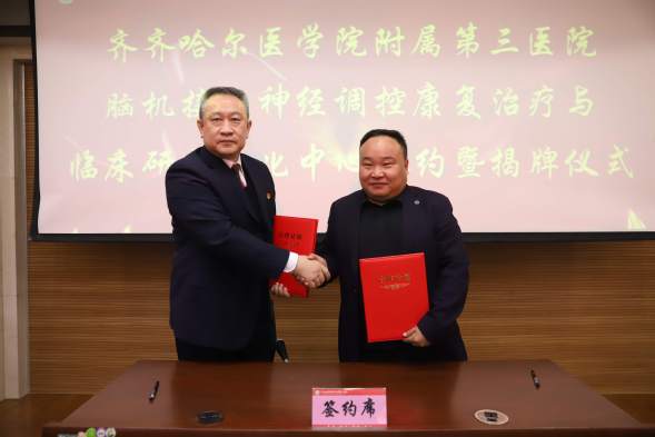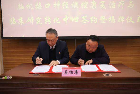 仪式上,我院党委书记孙茂林与翔宇医疗营销中心总监梁永强共同签署战略合作协议。随后,“脑机接口神经调控康复治疗与临床研究转化中心”正式揭牌。