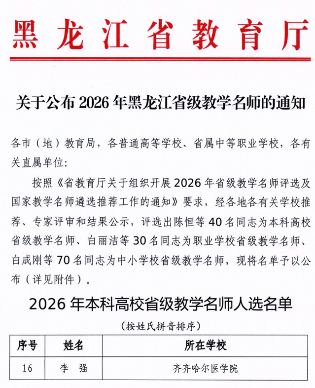 近日,黑龙江省教育厅公布了2026年黑龙江省级教学名师评选结果,学院李强教授获评2026年本科高校省级教学名师,这一殊荣彰显了学院在医学教育领域强劲的教学实力与卓越的人才培养质量。