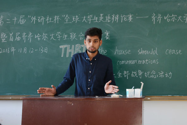 本次比赛由齐齐哈尔大学外国语学院主办,采用国际通用辩论赛制英国议会制,辩题包括“是否将学术作假视为犯罪行为”、“大学招生名额是否应基于毕业生的就业率来分配 ”、“兼职工作是否对大学生活有益”等。学院10支参赛队伍中,4支留学生代表队参加了英文组比赛,2支留学生代表队和4支中国学生代表队参加了中文组比赛。比赛中,学院尼泊尔、加纳和巴基斯坦籍选手以及中国学生在赛场上与对手唇枪舌战,针锋相对,现场迅速升温,精彩不停,场下掌声频频响起。最终,学院加纳籍留学生KUSI BRIGHT 和尼泊尔籍留学生DHAKAL SANKAR PRASAD获得英文组“二等奖”,中国学生代表队获得二等奖1项,三等奖1项,加纳籍选手OLOGO SAMUEL和SEWOR GODWIN SOLOMON,中国学生赵宇获得“最佳辩手奖”,其他选手均获得 “优秀奖”,学院荣获“最佳组织奖”。