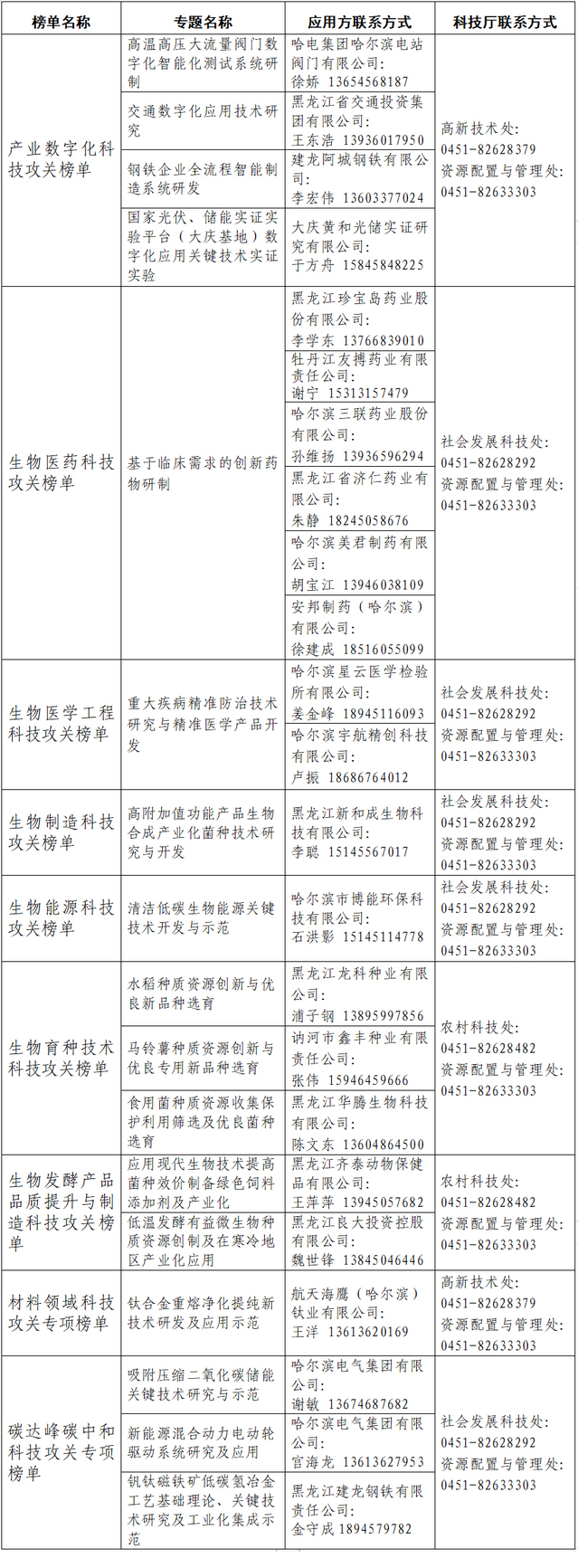 为贯彻党的十九大和十九届历次全会精神,认真落实黑龙江省第十三次党代会部署,根据黑龙江省委、省政府年度重点工作安排,黑龙江省科技厅大力推动省级科技计划管理改革,组织实施重大科技攻关任务“揭榜挂帅”机制。现将2022年黑龙江省“揭榜挂帅”科技攻关项目榜单予以发布。具体事项通知如下。