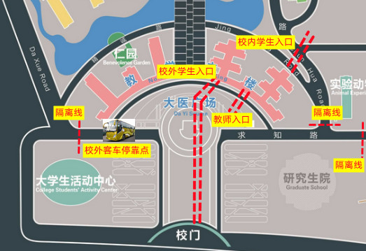 校内学生统一从教学主楼北区北侧入口进入考区;校外学生在校园入口处的警戒线内步行至教学主楼北区南侧入口进入考区。