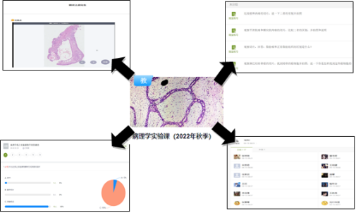 “一台”即微型态实验教学中心虚拟仿真教学平台 病理学实验课早期已经引入该数字切片平台,并且不断补充典型病例数字切片,建立了丰富的病理学数字切片库。数字切片库能够更清晰的展示病变全貌,有助于学生更好的理解病变;并且数字切片不受时间和地域的影响,学生可以结合学习通中切片的讲解进行自学。