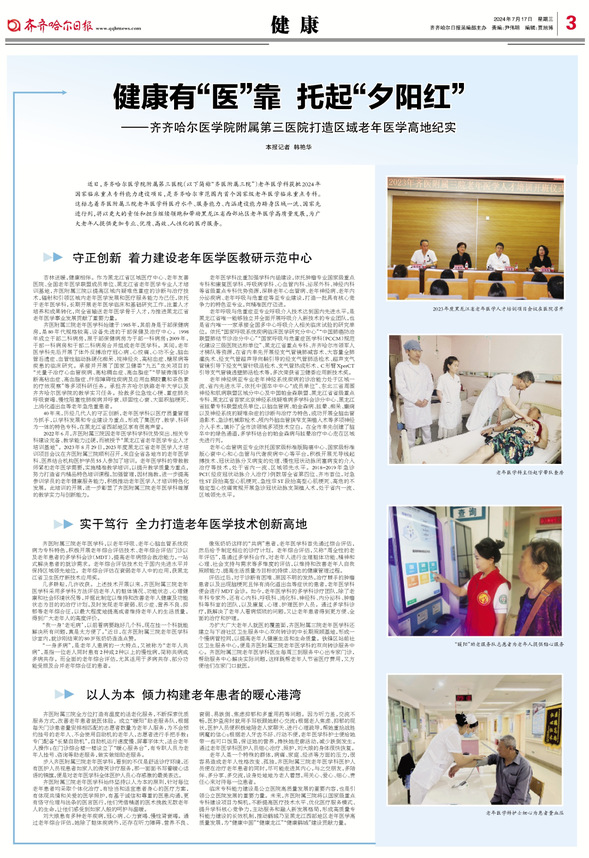杏林送暖,健康相伴。作为黑龙江省区域医疗中心、老年友善医院、全国老年医学联盟成员单位、黑龙江省老年医学专业人才培训基地,我院以提高区域内疑难危重症的诊断与治疗技术,辐射和引领区域内老年医学发展和医疗服务能力为己任,依托于老年医学科,长期开展老年医学临床和基础研究工作,注重人才培养和成果转化,向全省输送老年医学骨干人才,为推进黑龙江省老年医学事业发展贡献了重要力量。